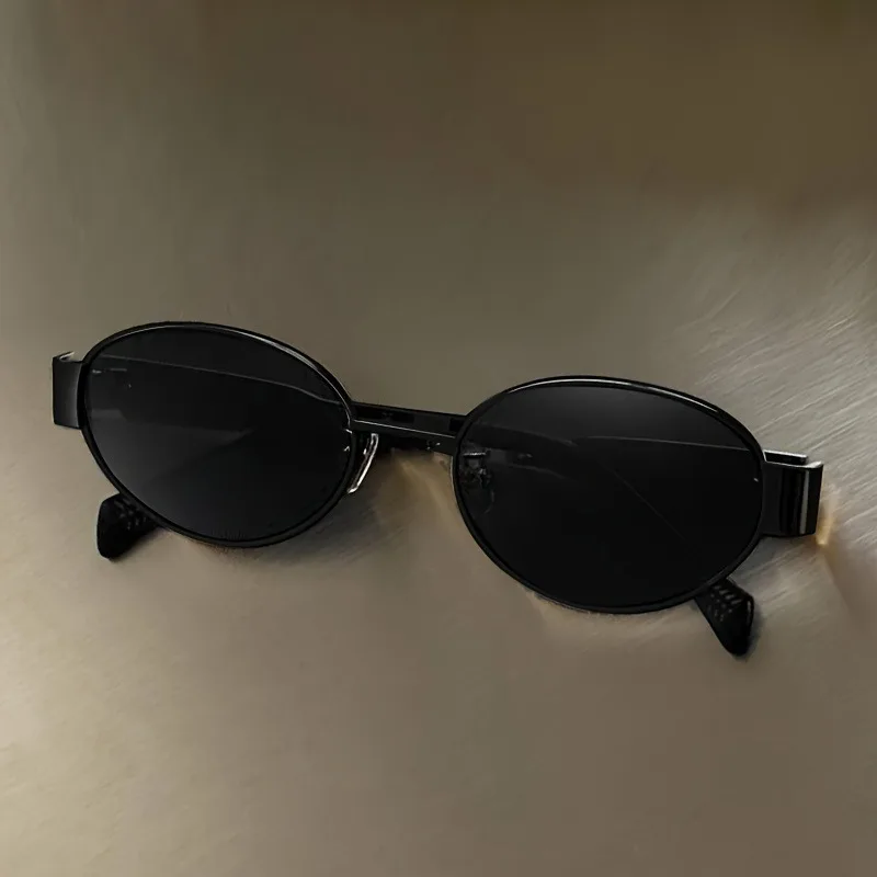 A armação em metal oferece durabilidade e um acabamento elegante que realça o formato oval.